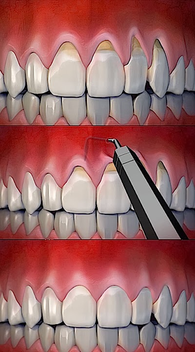 | Top To Bottom: Receding Gums, During Pinhole Gum Rejuvenation, Gums Restored To Healthy Position In Minutes Without Gum Grafting. |